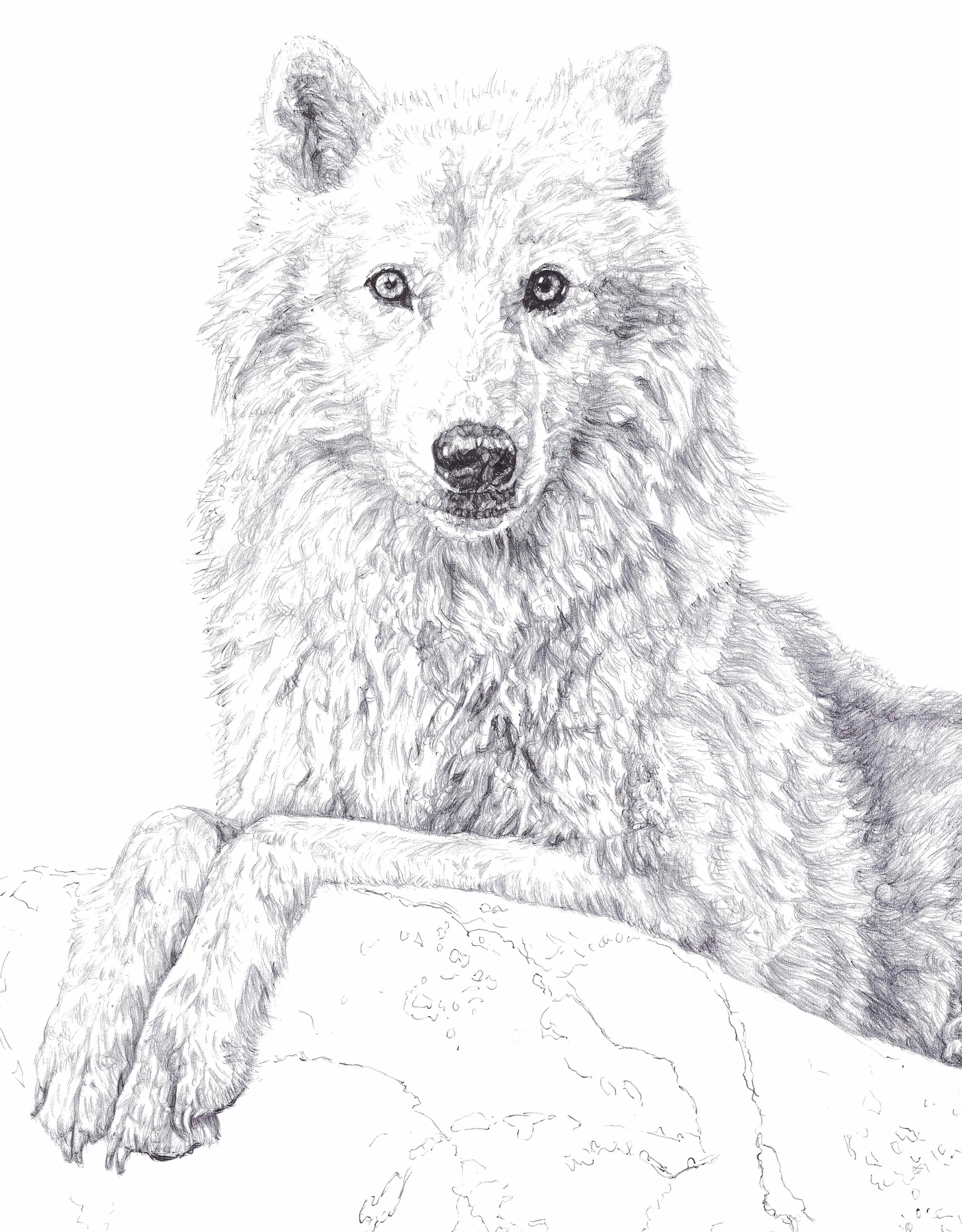 This year I wanted to celebrate beautiful Atka, WCC’s magnificent Ambassador wolf, by making a portrait of him drawn in black Biro to donate to WCC’s fundraiser.  Atka has dedicated his life to educating people about protecting his wild brothers and sisters.  I imagined the rock Atka sits on as his favourite spot where he surveys the world around him and thought this is how I should draw him, King of New York State.