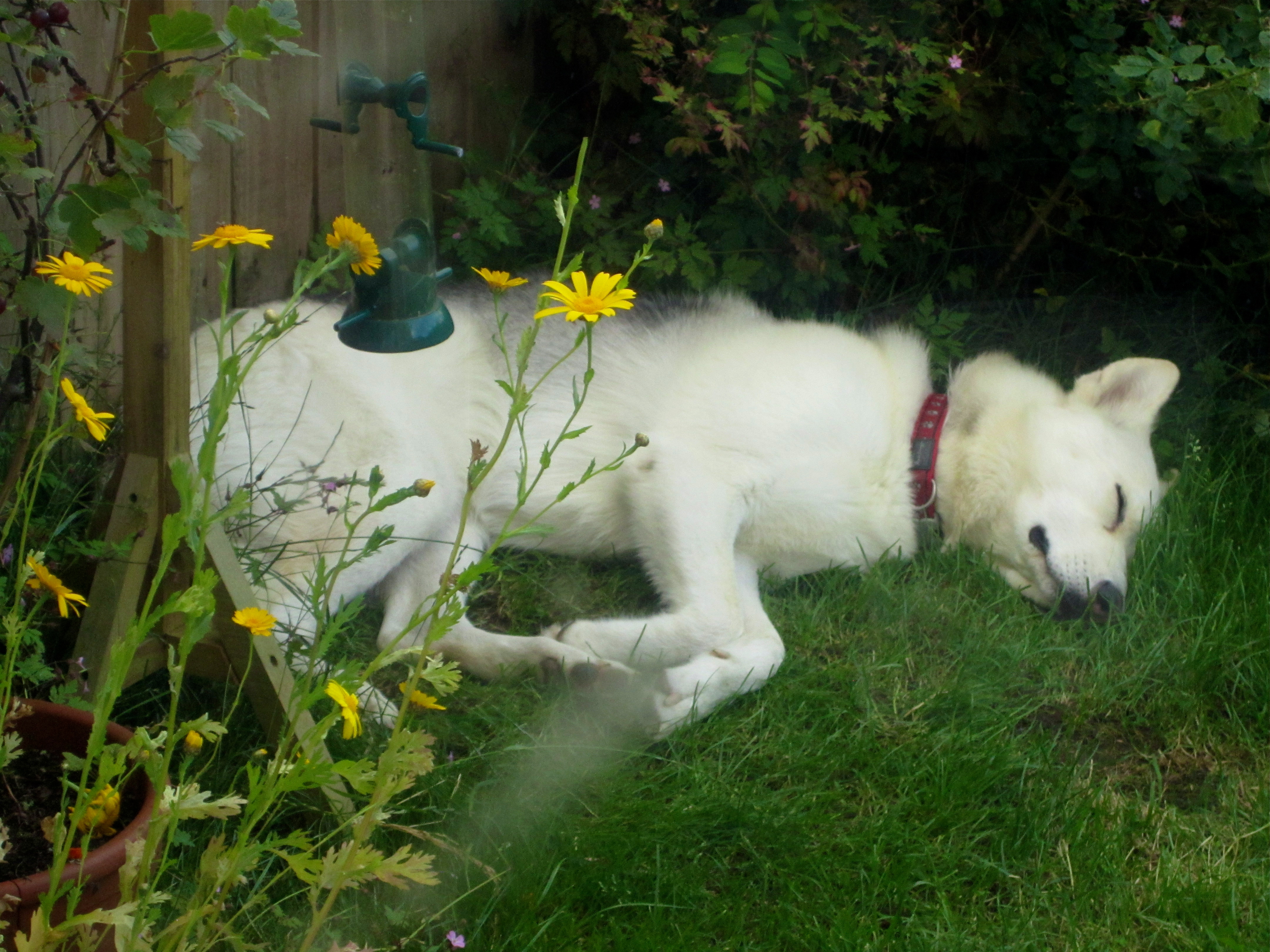 IMG_8913May –  “In my recreational time I love to lie in the garden amongst the flowers and sleep.  I often dream about rabbits and barking at other dogs”