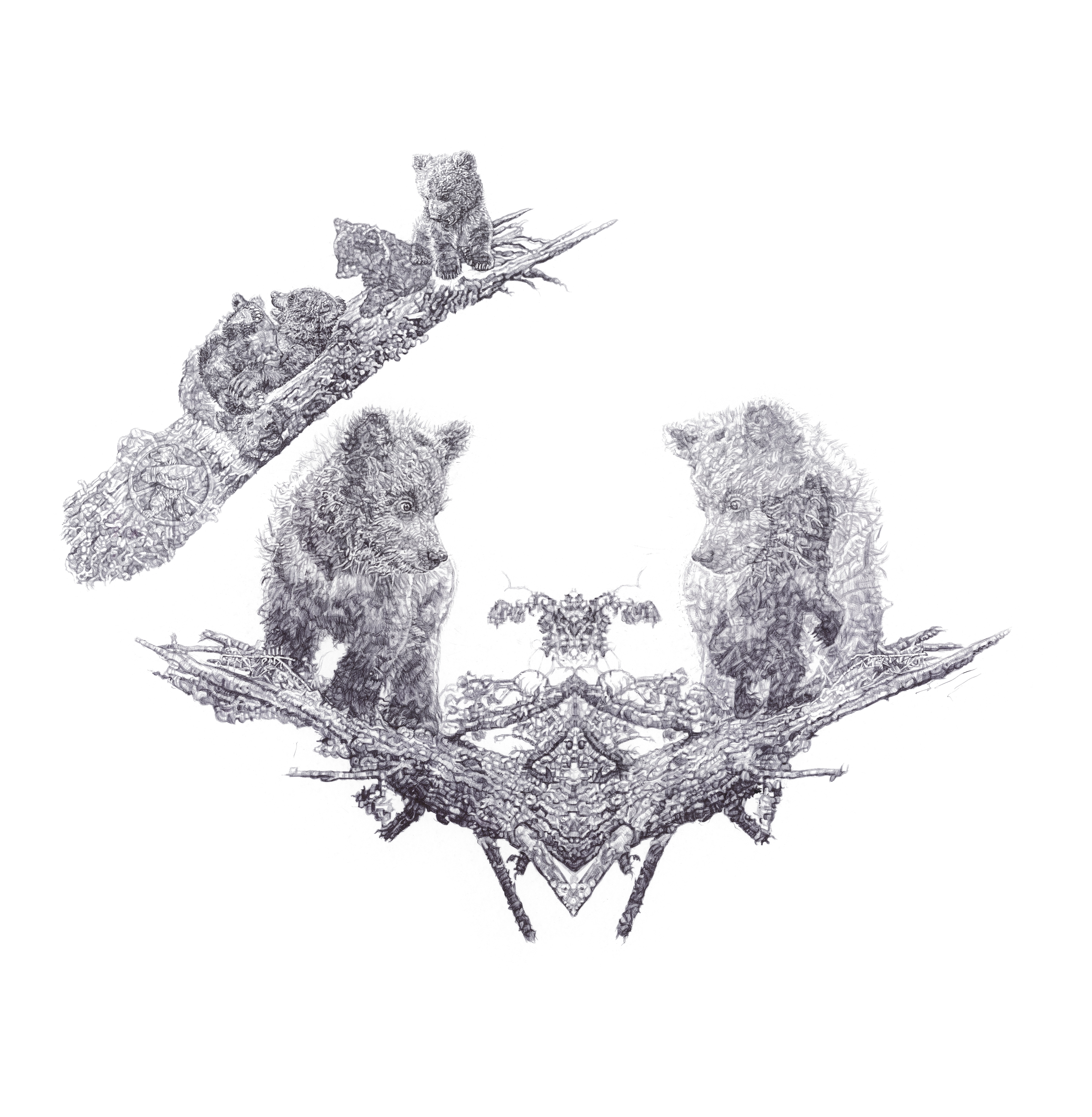 ‘The Orphans’, Brown Bears, In Homage to the Last Great Carnivores of Eurasia’, black Biro drawing by Jane Lee McCracken