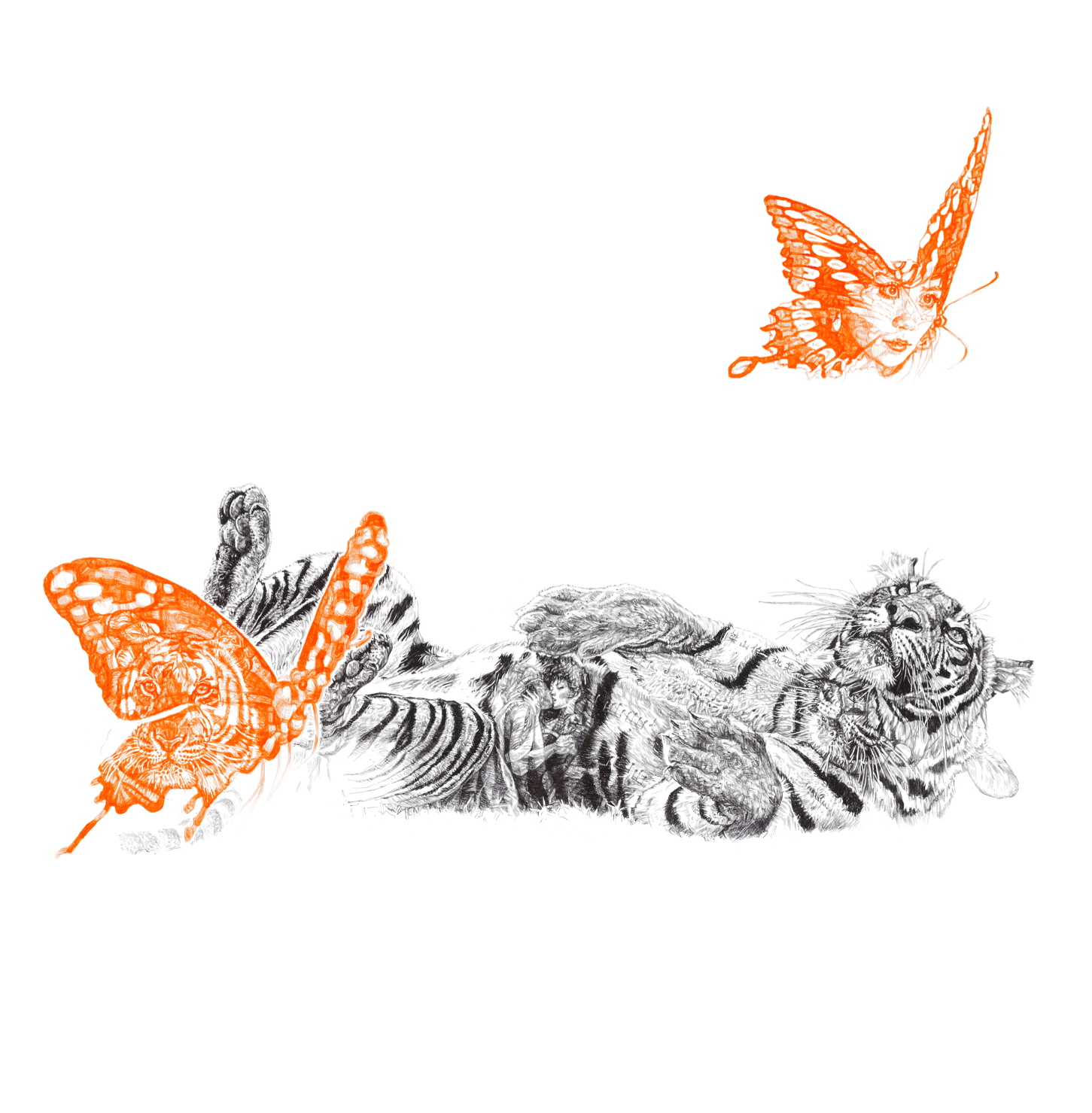 ‘Butterfly Lover’, Luxury large format Archival Pigment Print of original black and neon orange Biro drawing by Jane Lee McCracken