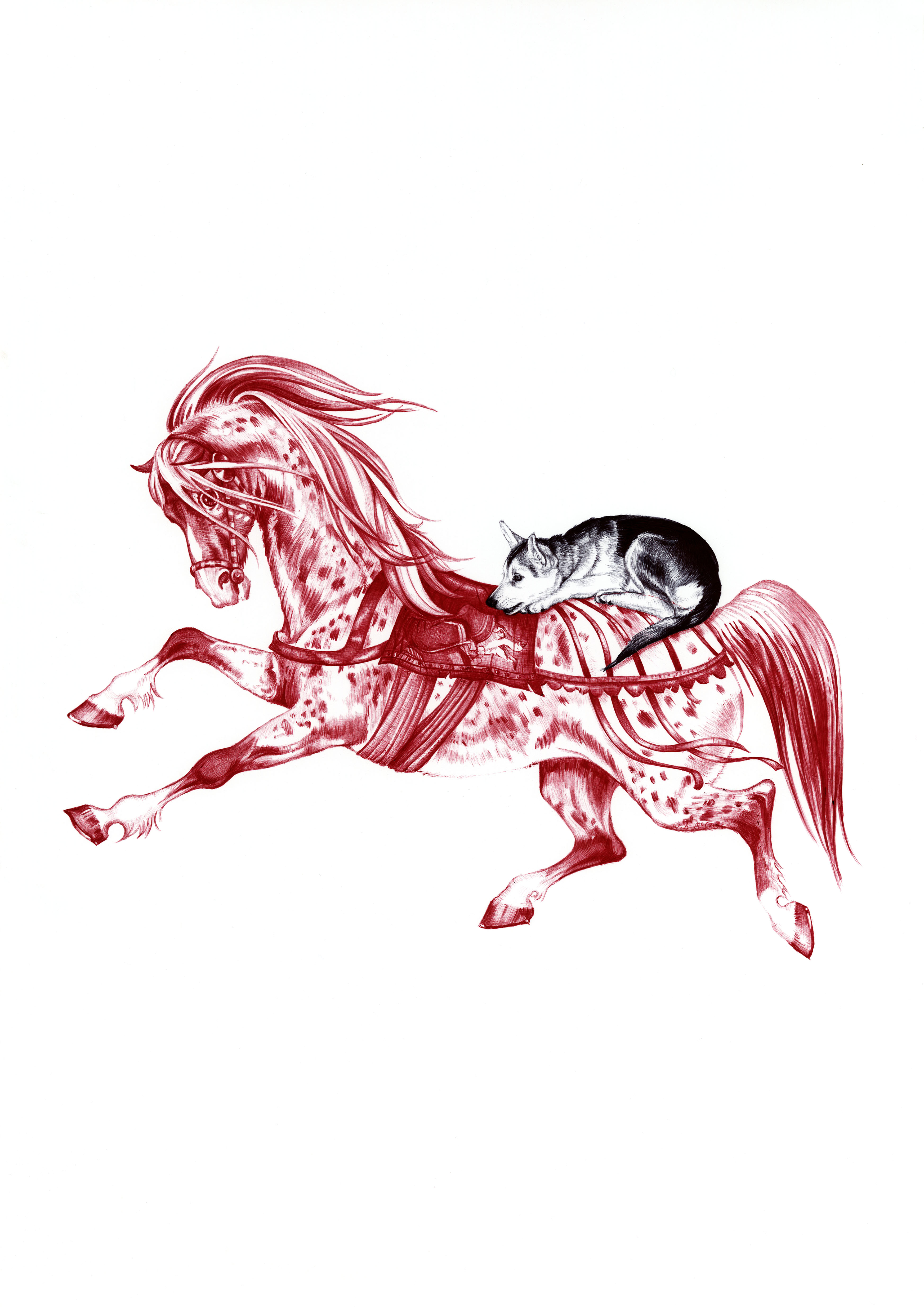 'Red Horse and the Wolf Cub - After Janet and Anne Grahame Johnstone', 2009, red and black Biro drawing by Jane Lee McCracken