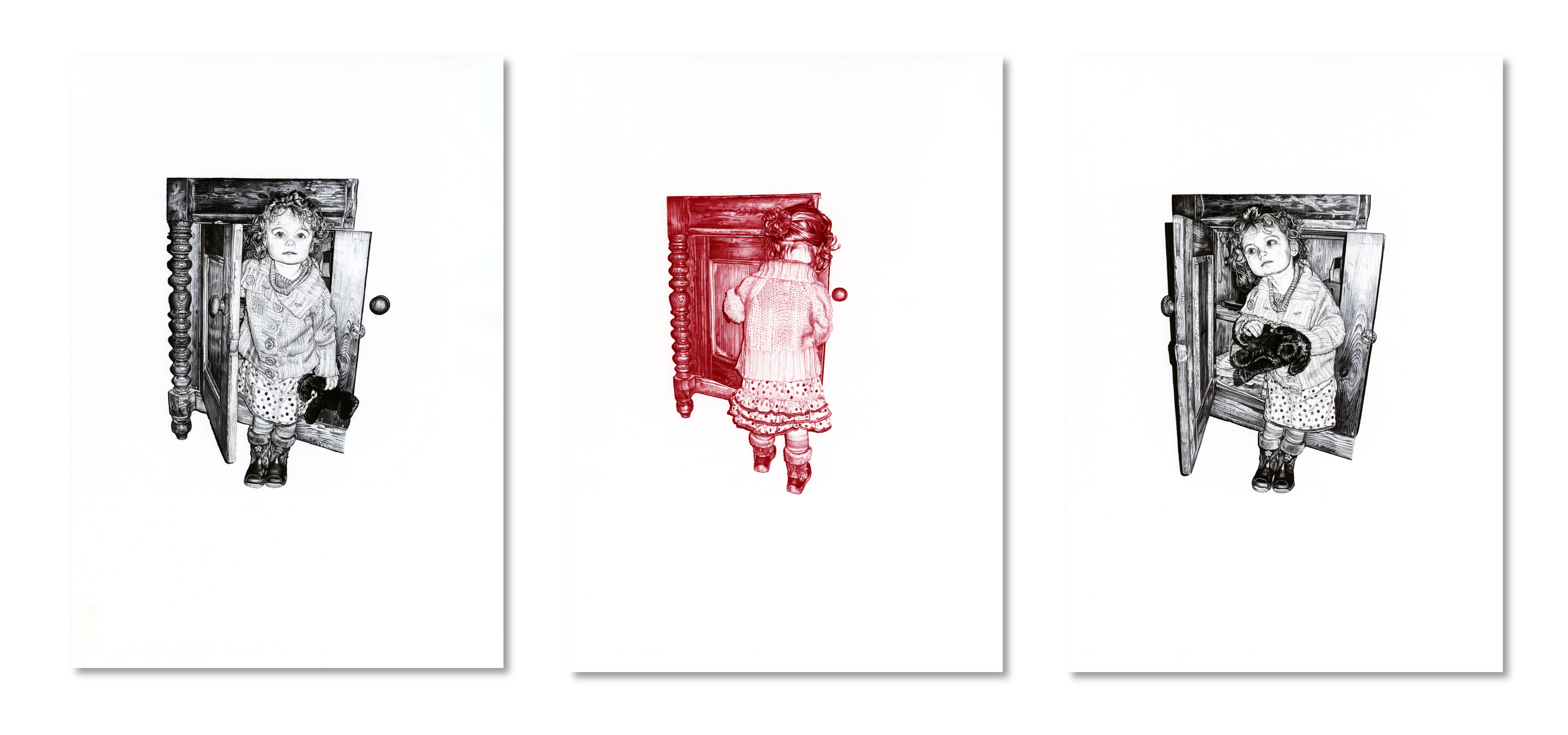 'The Sideboard II', 2009, red Biro drawing by Jane Lee McCrackenThis triptych portrays memories of a small child at play in a sideboard, within the safety of ‘home’, before the onset of war. It was inspired by the girl in the red coat from the film ‘Schindler’s List’, 1993, Steven Spielberg, as she wanders through the Kraków Ghetto while it is being ‘cleared’’. The Artist uses her niece to model for this piece to highlight the indiscriminate nature of war and how it can affect ‘anyone’ and to provoke understanding of loss by seeing victims as individuals and not statistics.