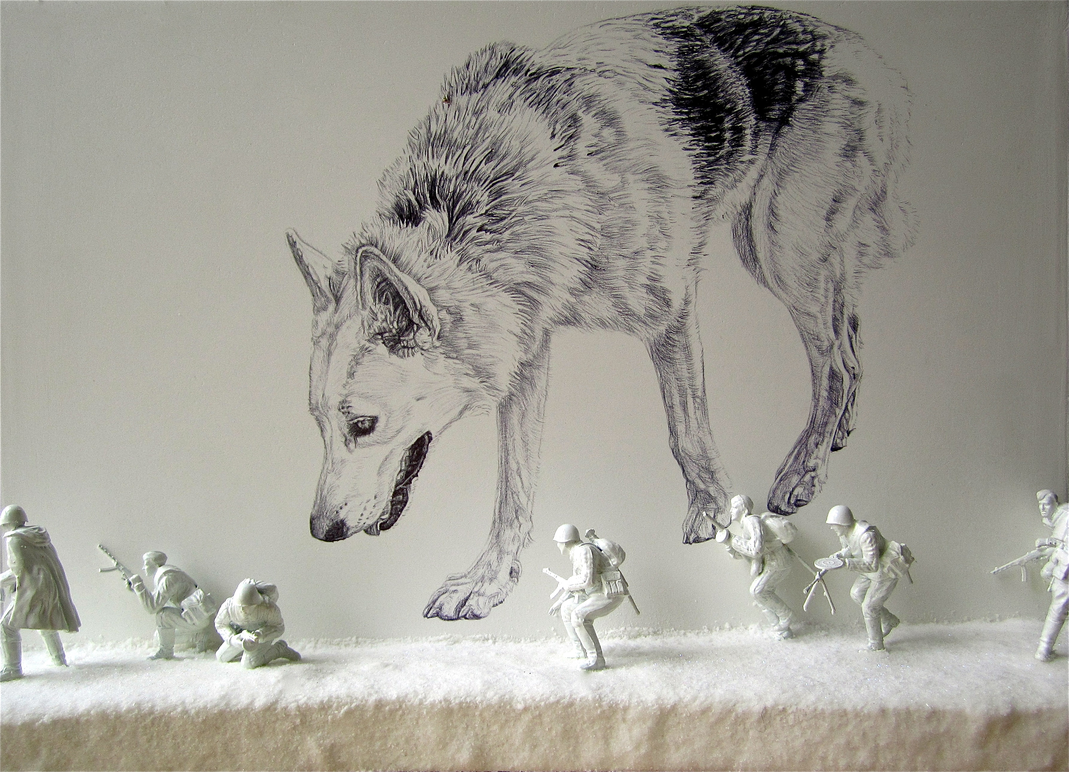 My drawing entitled ‘Lily’ represents pets that are left behind during war and disaster; the dog’s owner took the furniture instead.