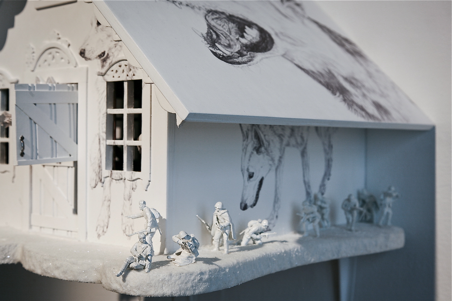 The dog in the drawing is my own dog, Lily. She lies on the memory of a chair representing owners who took furniture and personal belongings instead of their pet leaving the family dog to fend for itself amongst the wreckage of war and disaster.